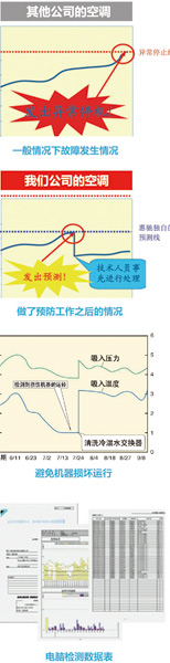 預防性工作一般包括 系統(tǒng)點檢就是將外機通過特有接口轉接到電腦上,在機器運行平穩(wěn)后通過專有軟件得到機器運行的所有參數(shù),將這些參數(shù)與正常運行值進行比較,找到其中的異常. 排查是根據(jù)點檢結果展現(xiàn)的異常趨勢判斷可能出現(xiàn)的問題,然后逐一排查確認.包括對系統(tǒng)的初始設計、工程安裝做重新審查. 修復包括機組的維修、系統(tǒng)大修和進行必要的改造,包括機組的使用建議等,以確保有系統(tǒng)能夠在長期平穩(wěn)運行.這就需要維保有單位不但要有清洗能力,還要具體維修、設計和安裝的能力. 大修是指是預防性定期維護保養(yǎng)服務之一.大修涉及對有異常現(xiàn)象的設備部分進行拆卸和檢修.檢測空調(diào)設備的損耗情況,并提供改進方案,并及時更換原廠配件. 對于較大的項目,通常工作步驟為:勘查現(xiàn)場,了解現(xiàn)狀->確定工作內(nèi)容->清洗、修復、點檢->交付維保報書